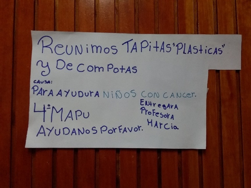 Con apoyo de la Docente la Srta. Marcia Olivares Rain, los alumno del 4° año Mapu, se propusieron recolectar tapitas plásticas y de compota para ir en ayuda de los niño/as con cáncer. Para ello los alumnos del curso han creado diversos afiches promocionando su iniciativa para que la comunidad educativa también forme parte de su cooperación.